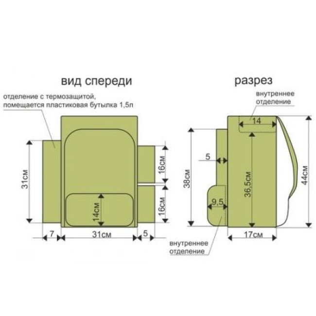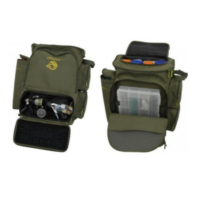 Рыбацкий рюкзак, основной объем 26 л. 6 наружных карманов: боковой карман с темозащитой, рассчитан на емкость до 1,5 л.; нижний жесткий карман для 2-х катушек с запасными шпулями; два боковых кармана для аксессуаров; фронтальный карман где можно разместить коробку 35*21*5 см; верхний карман с внутренним объемом, 15*27*8 см. Прорезиненное дно, уплотнитель в спине рюкзака - пенополиэтилен (1см). Съемное внутренне дно из пластика.