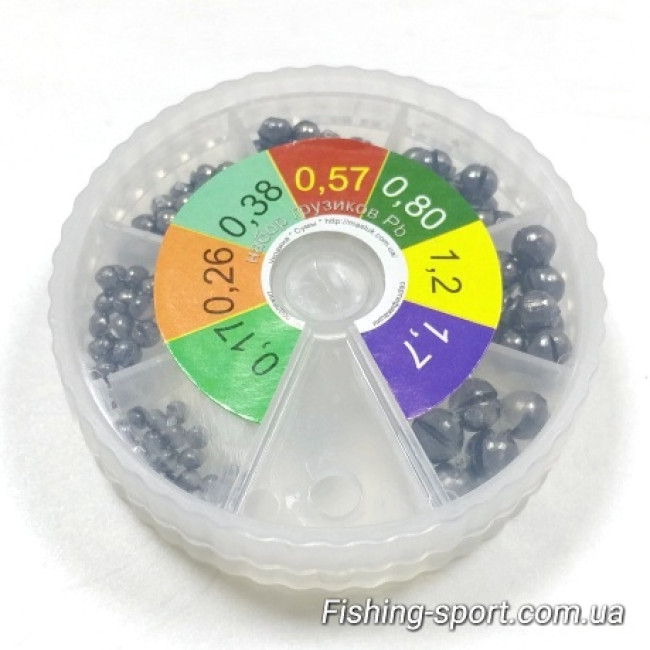 Набор грузов 60 гр (323558) разрезные свинцовые дробинки для оснащения удочки с поплавком. Количество весов 7 от 0.17 гр до 1.7гр