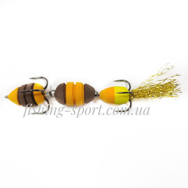 Тип монтажа шарнир на джиг-головке (желательно)разборной для удобства монтажа. Приманка не имеет собственного веса,в воде занимает вертикальное положение благодаря пористому материалу из которого изготовлена основа.