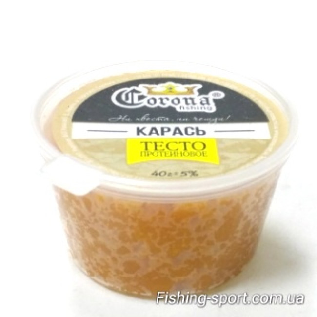 Тесто протеиновое торговой марки Корона Украина отличная насадка для ловли карася, плотвы и другой рыбы. Фасовка удобная пластиковая емкость с крышкой. Не плывет и хорошо держится на крючке для отсечения мелочи делайте шарик покрупнее и крупная рыба обязательно клюнет.